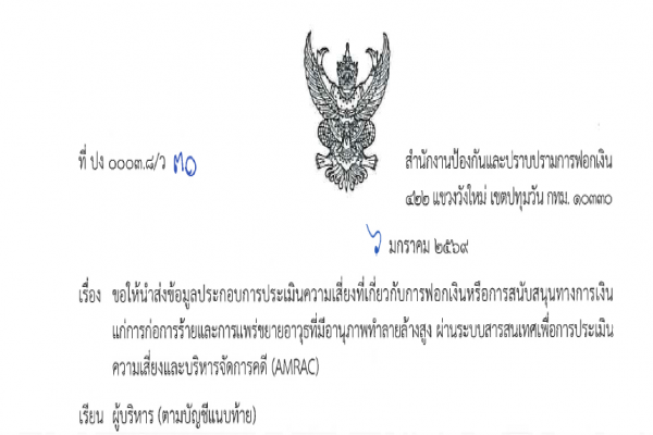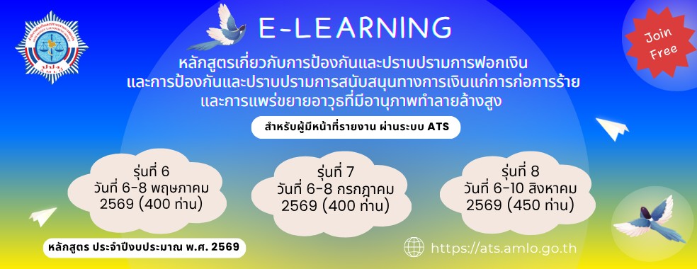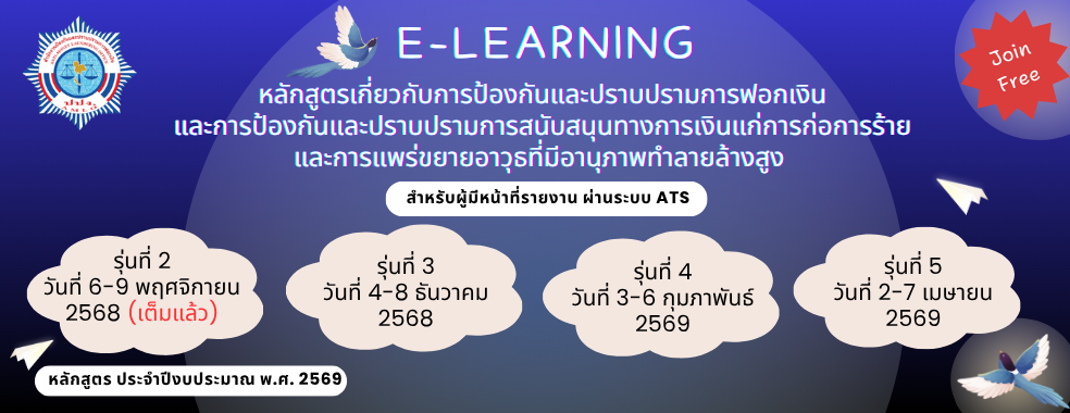 กำหนดการอบรมรูปเเบบ E-learning หลักสูตรเกี่ยวกับการป้องกันและปราบปรามการฟอกเงิน และการป้องกันและปราบปรามการสนับสนุนทางการเงินแก่การก่อการร้ายและการแพร่ขยายอาวุธที่มีอานุภาพทำลายล้างสูง ปีงบประมาณ 2569
