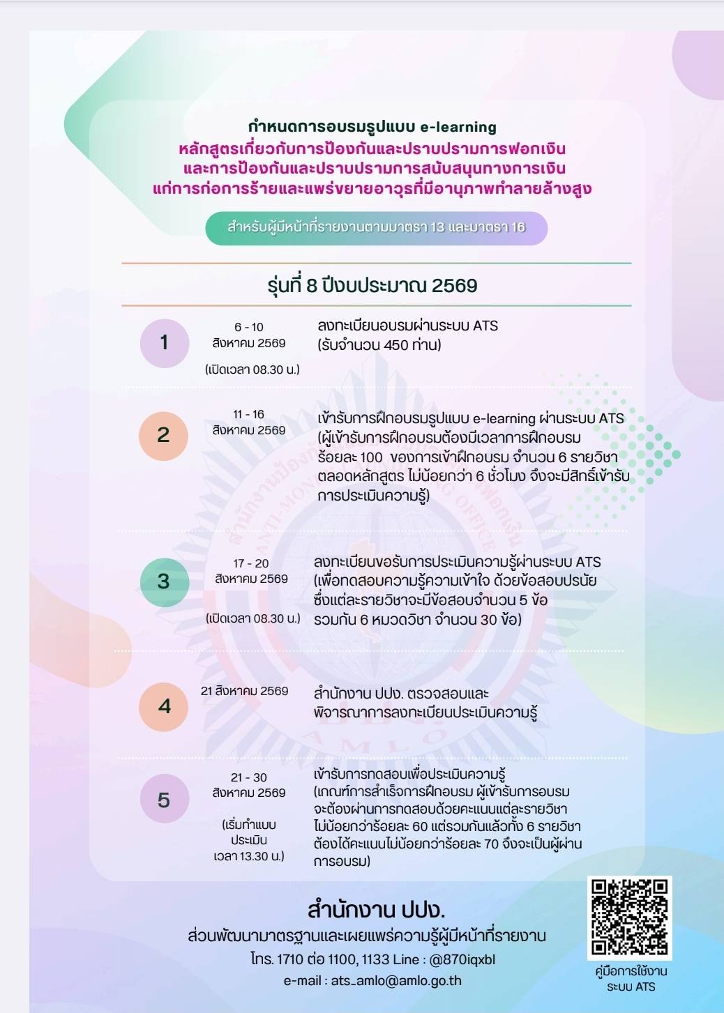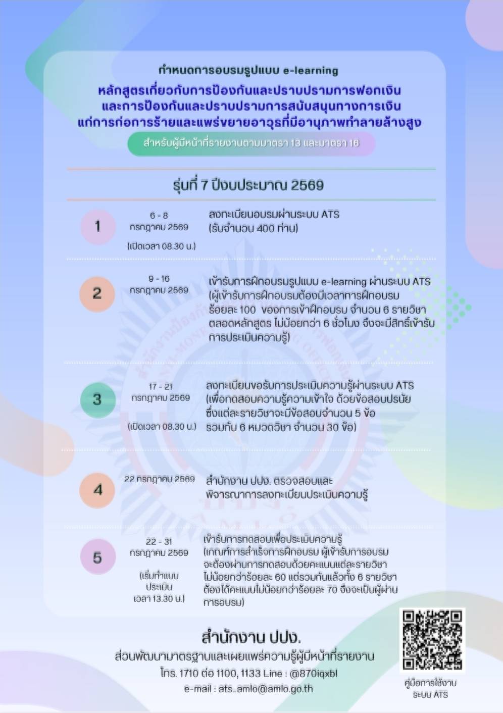 ▶️ กำหนดการอบรมรูปแบบ e-learning ผ่านระบบบริหารจัดการฝึกอบรมและประเมินความรู้ในเรื่องกฎหมายว่าด้วยการป้องกันและปราบปรามการฟอกเงิน(AMLO Training System : ATS) รุ่นที่ 1 - 5 ปีงบประมาณ 2569 https://www.amlo.go.th/index.php/th/news/detail/18249